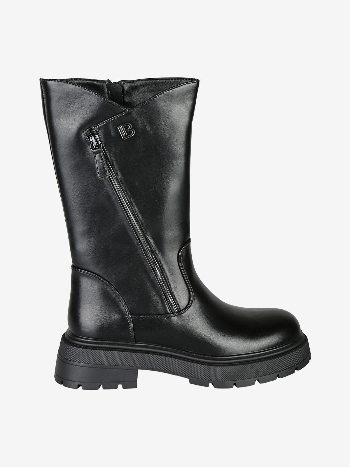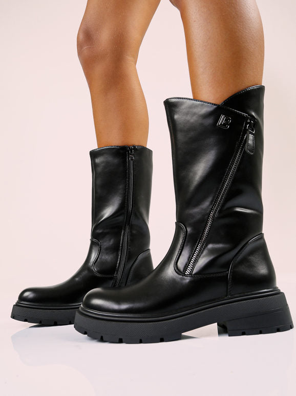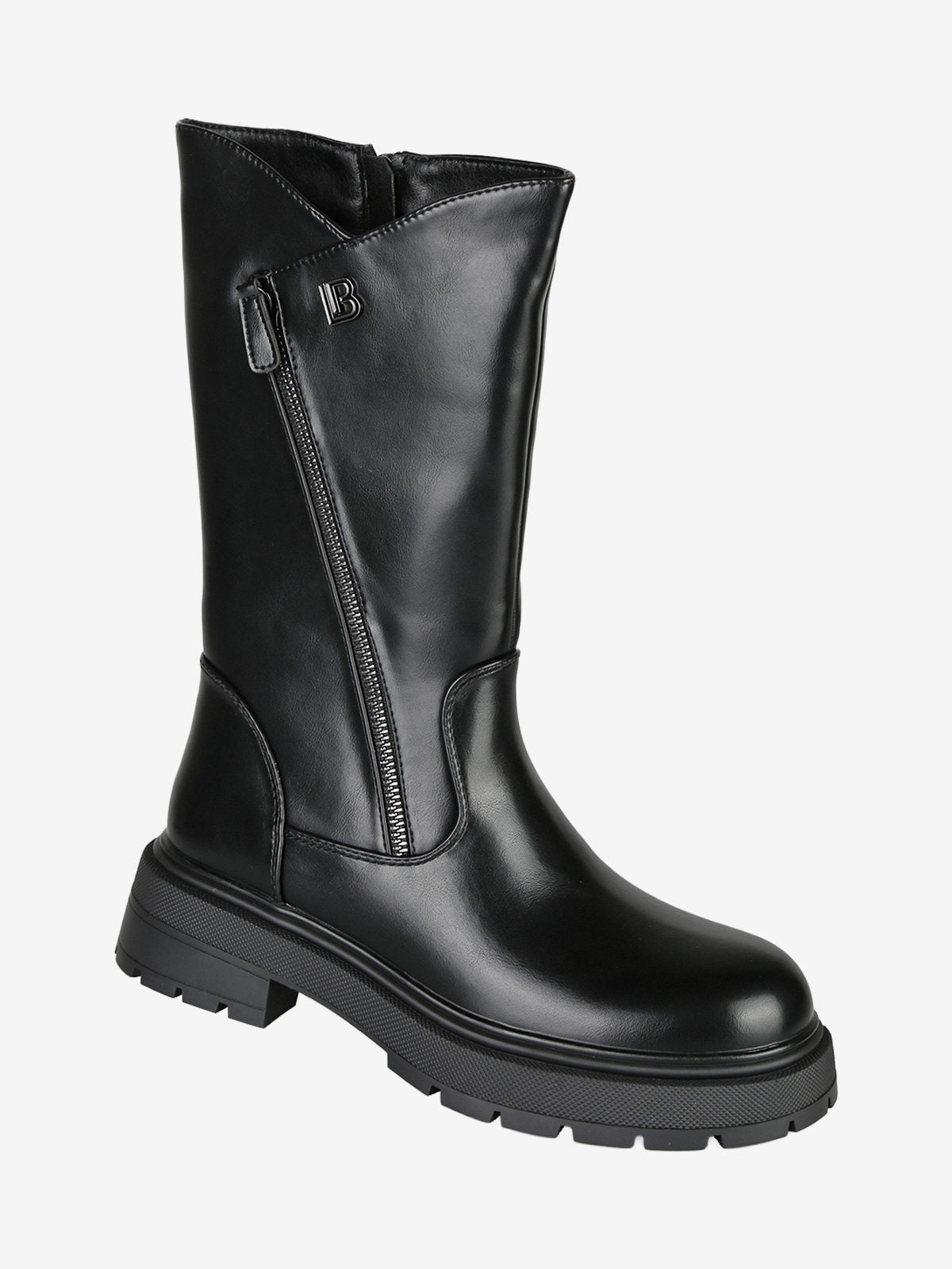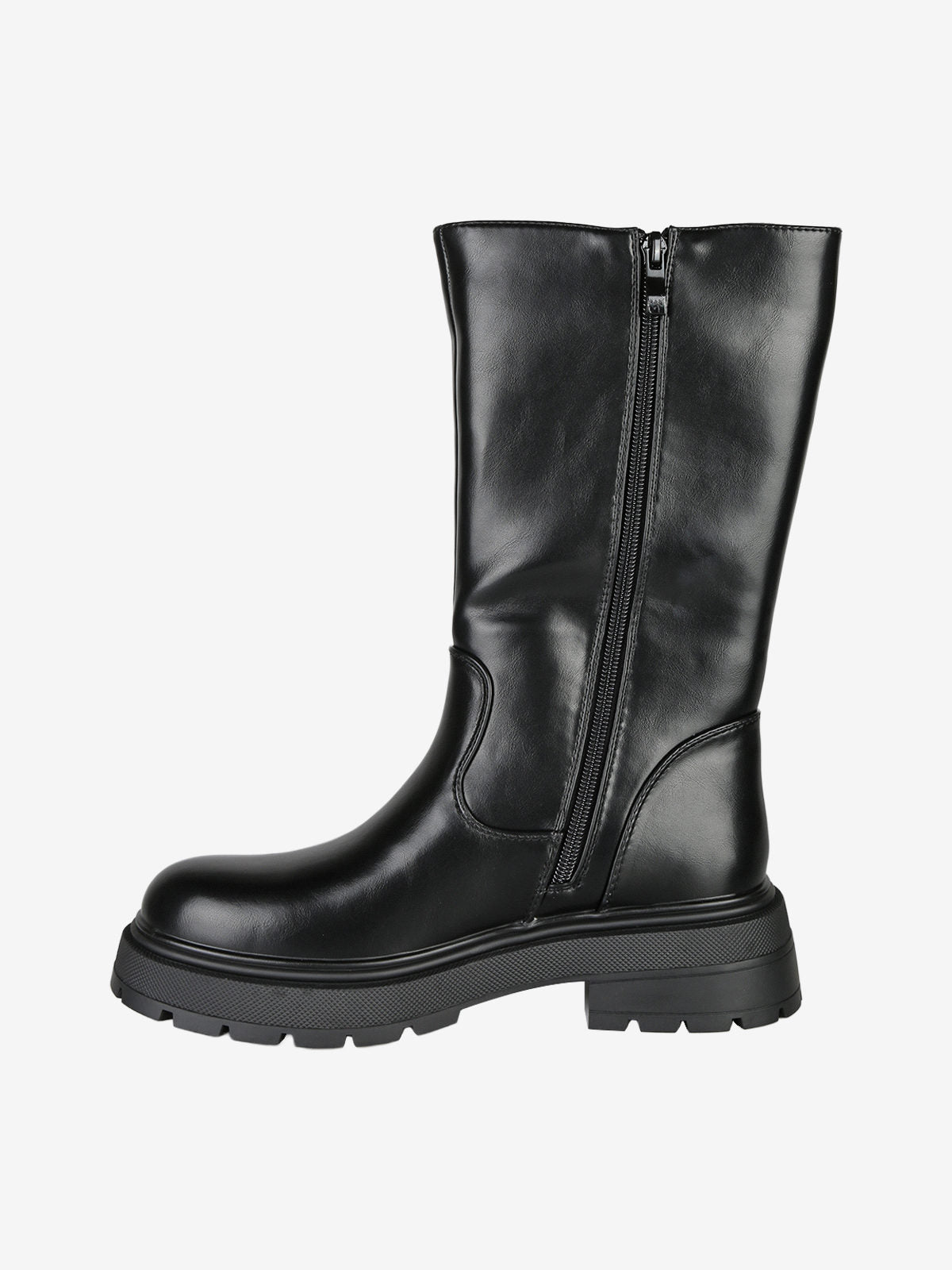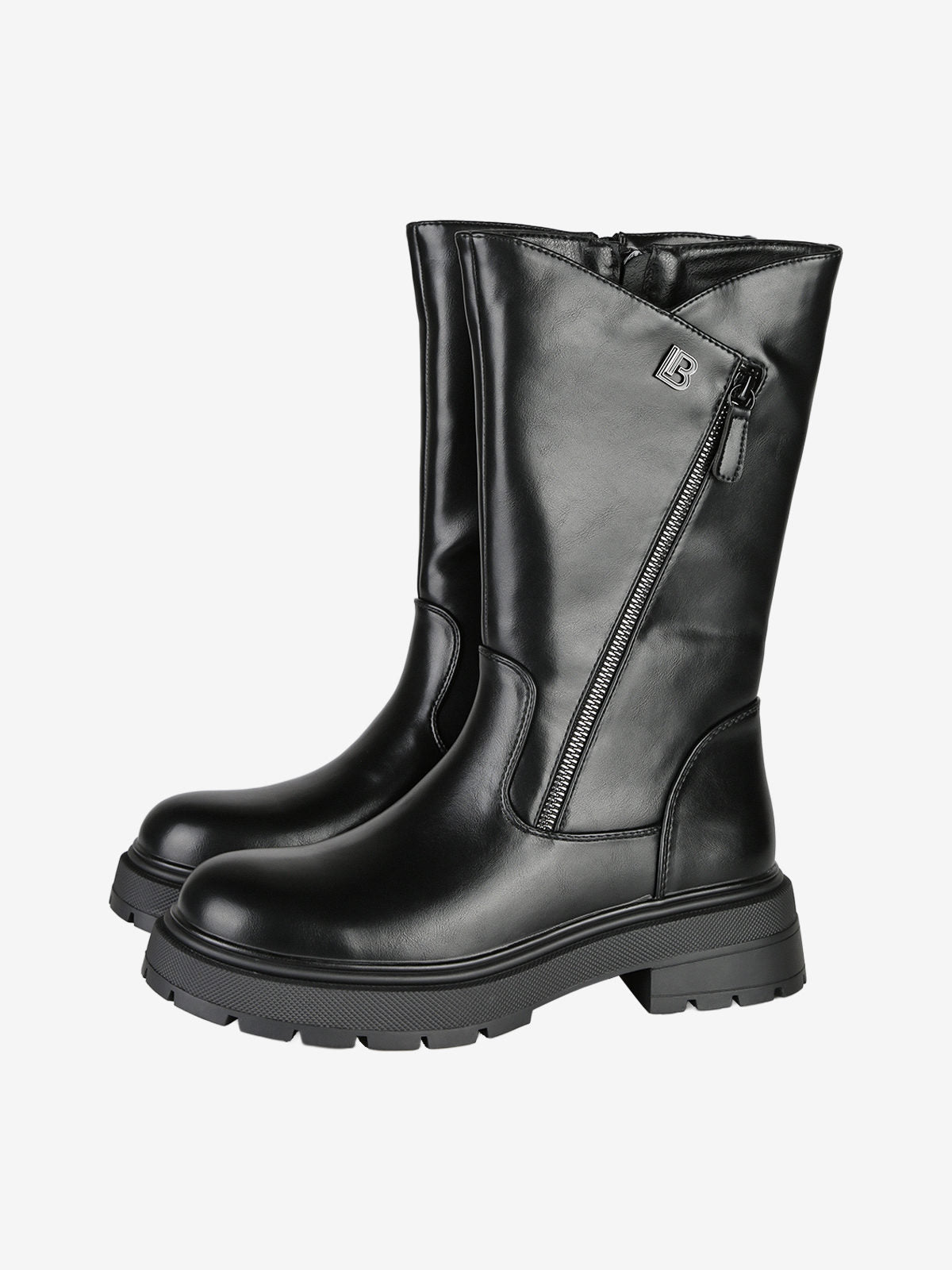 Anfibio senza lacci con fondo in gomma alta 5 cm, in eco pelle semplice ma adornato da una zip evidente finta, puramente estetica. Calzata comoda grazie alla zip laterale che si apre per infilare comodamente il piede.