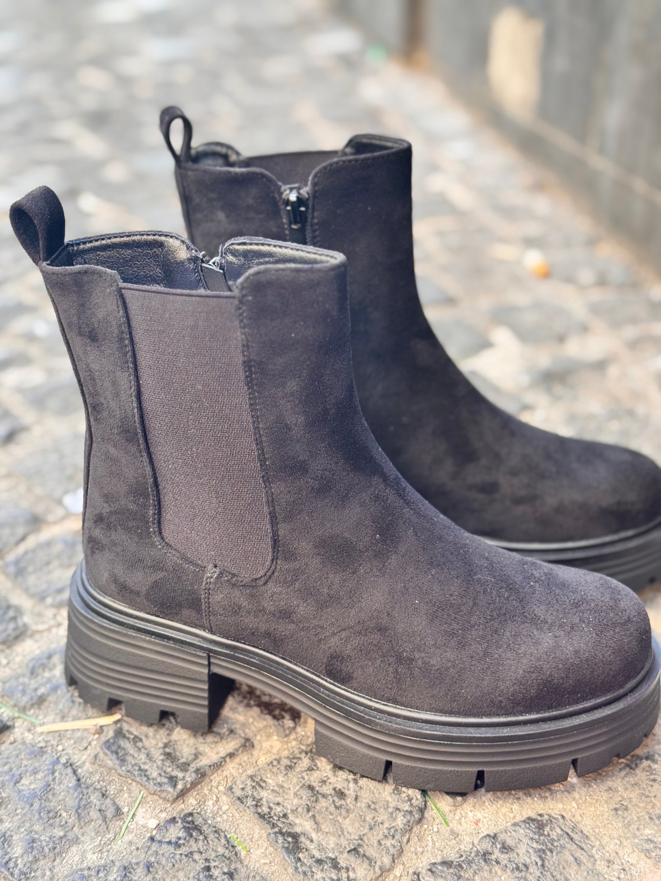 Anfibio in camoscio con elastico al lato esterno, calza comodamente frazie alla lampo laterale, fondo in gomma alto 6 cm.