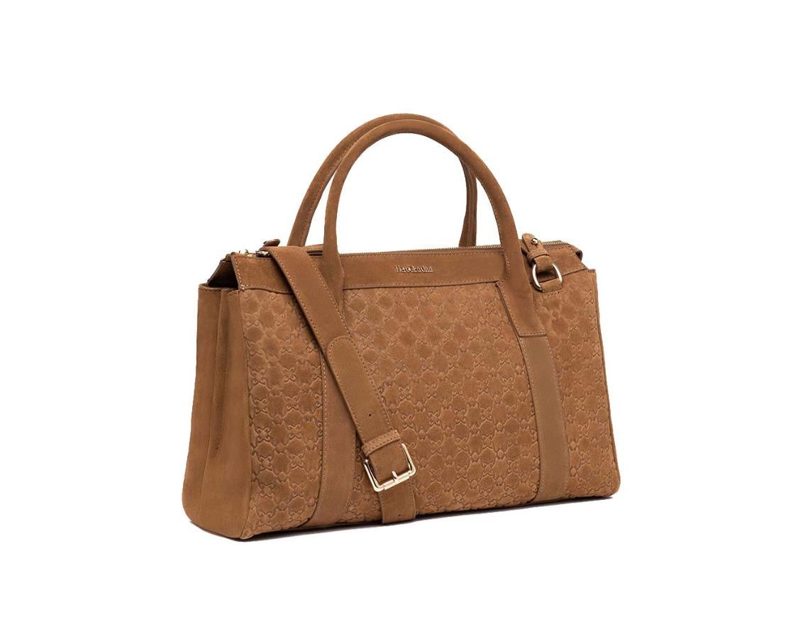 Borsa a bauletto in camoscio infamante logata a fuoco con tutti i loghi che vanno a formare una trama astratta, ideale da portare a mano ma dotata sempre di tracolla per poterla Indossare a spella ed avere comodità maggiore. Borsa leggera ma capiente
