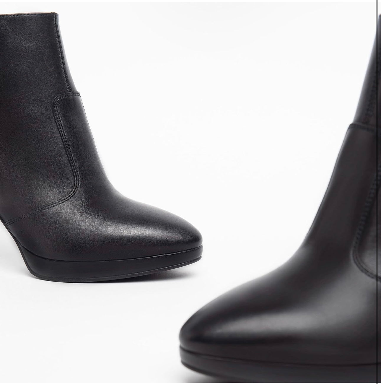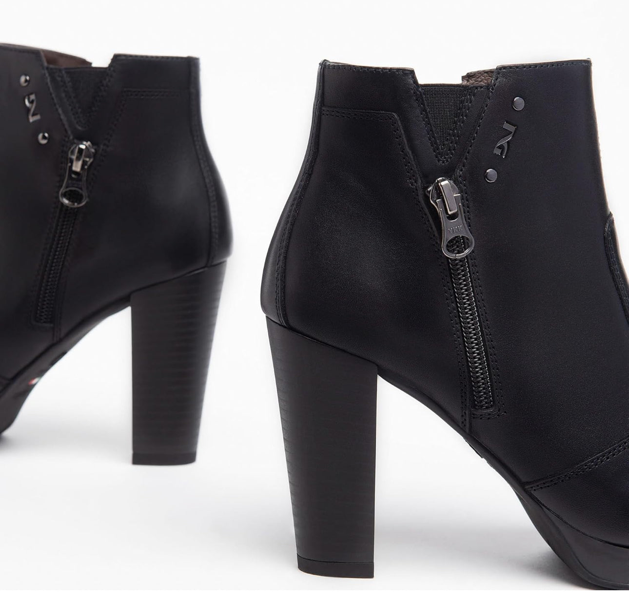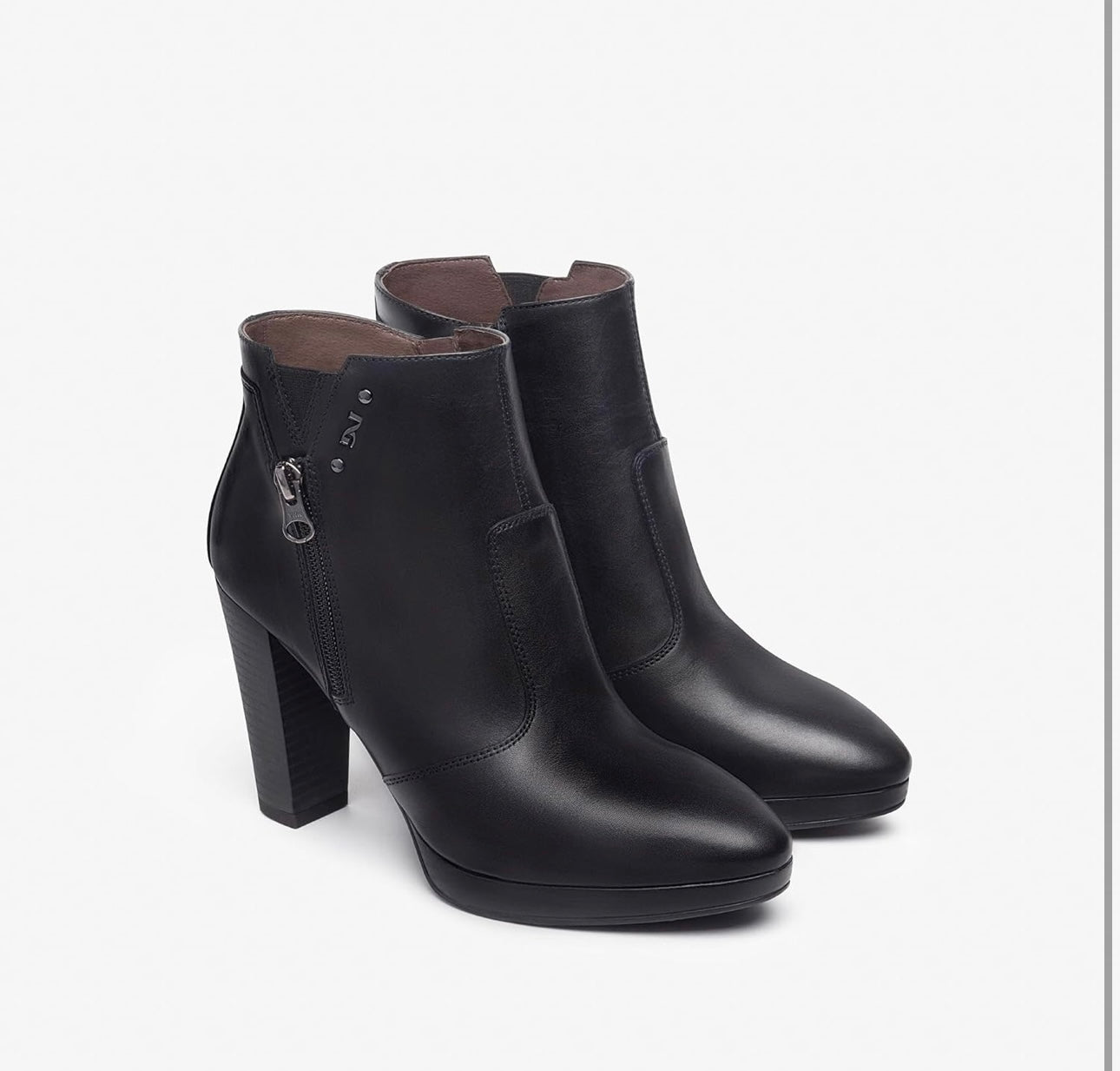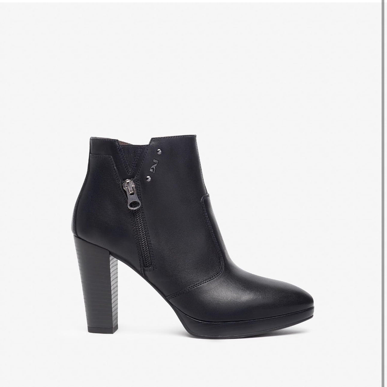 Tronchetto in pelle con piccolo spighetto elastico laterale vicino al quale troviamo il logo metallico è una piccola zip puramente estetica. Mentre la chiusura è con una classica lampo laterale. Tacco alto 10 cm con platoux di 1,5 cm