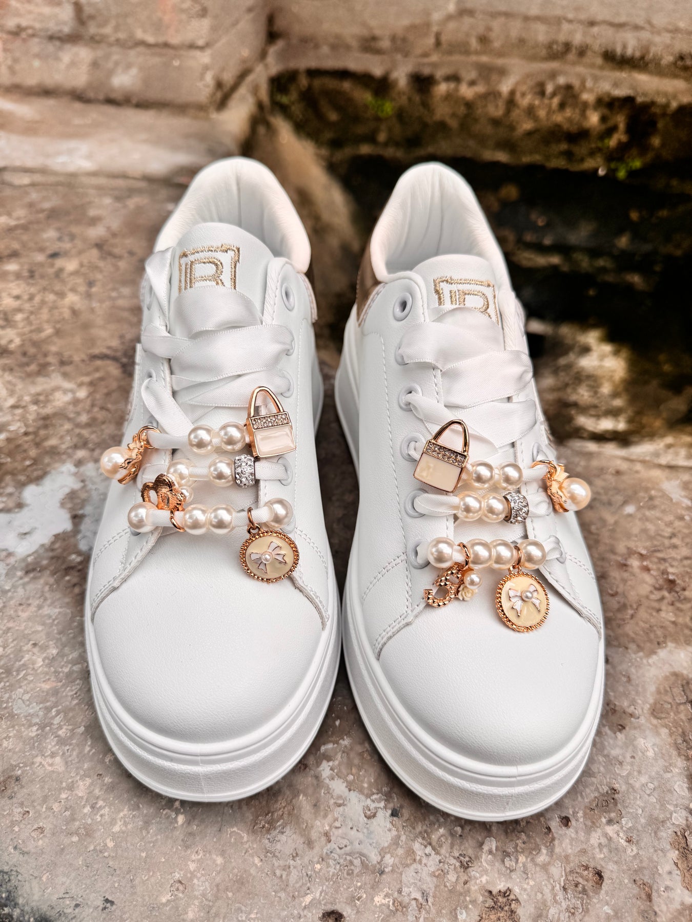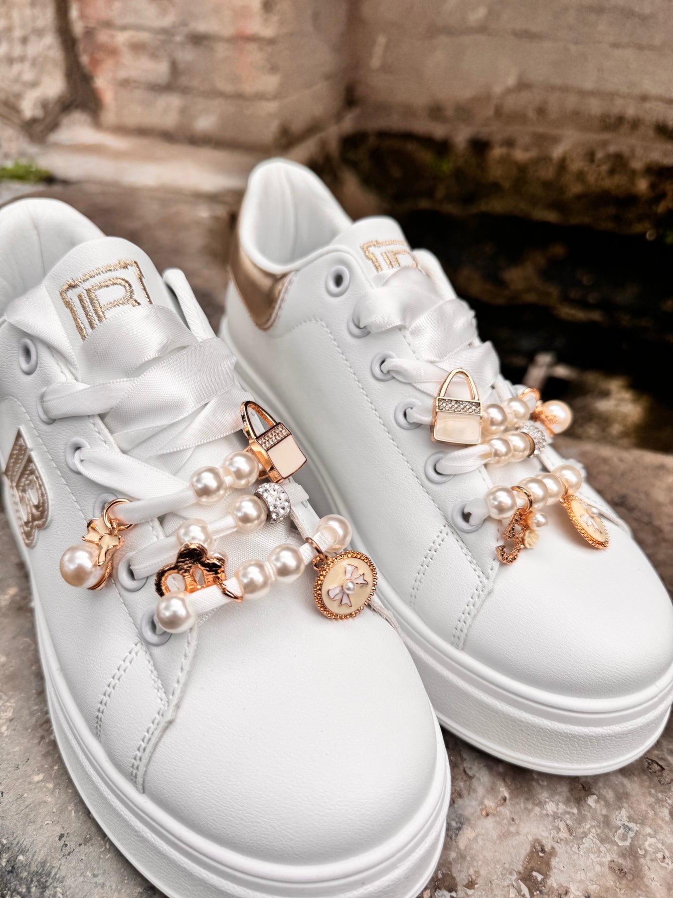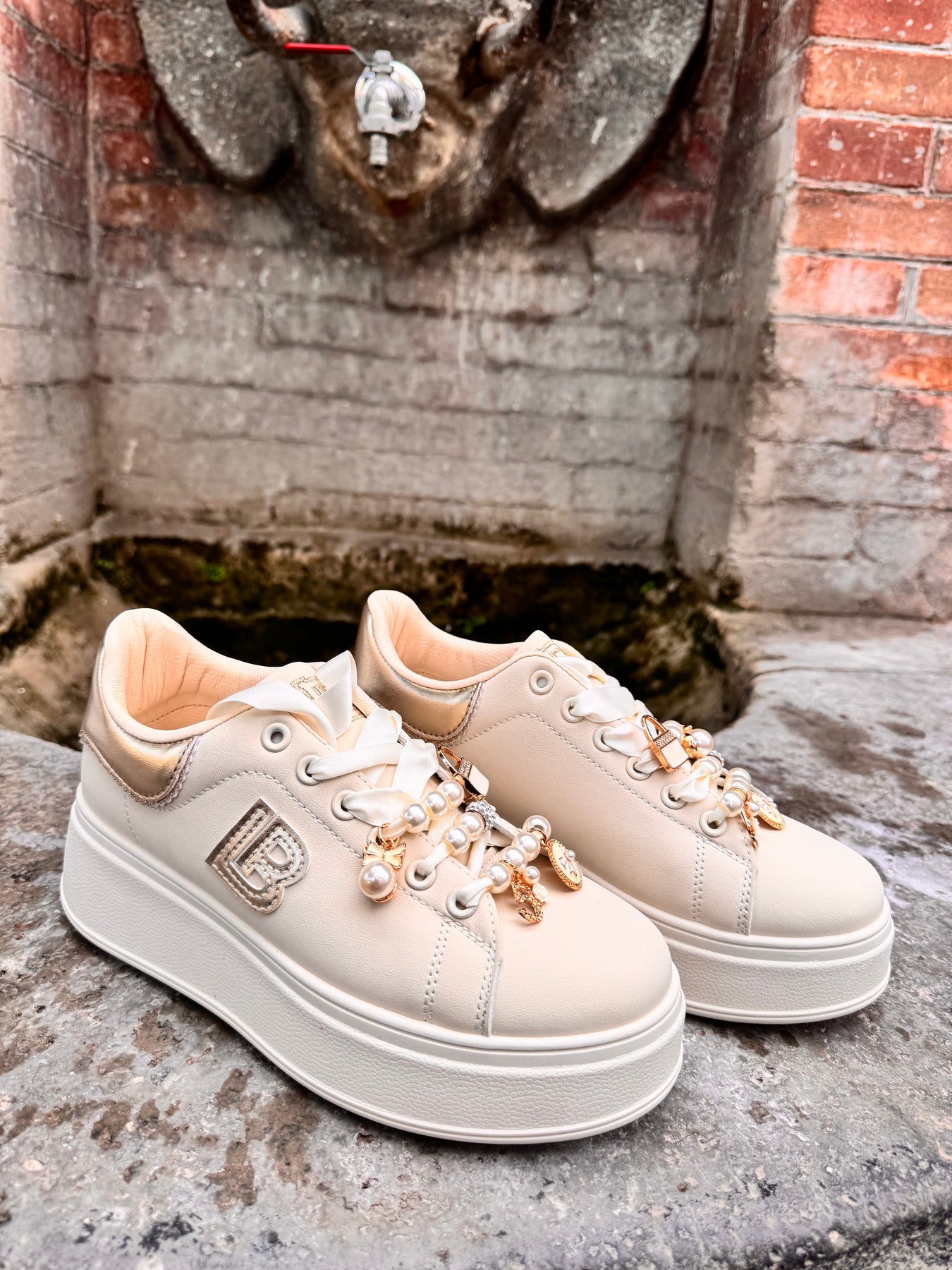 Sneakers in ecopelle con lacci in raso intercambiabili con lacci in tessuto che escono in dotazione, arricchita con perline e charms removibili. Plattform alto 5 cm. Sottopiede estraibile in memory.