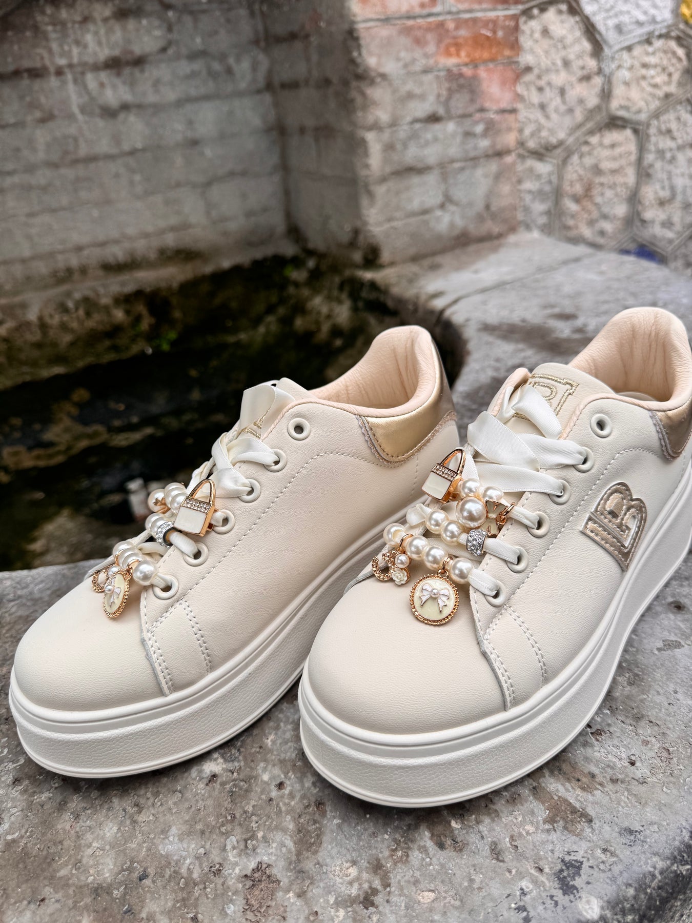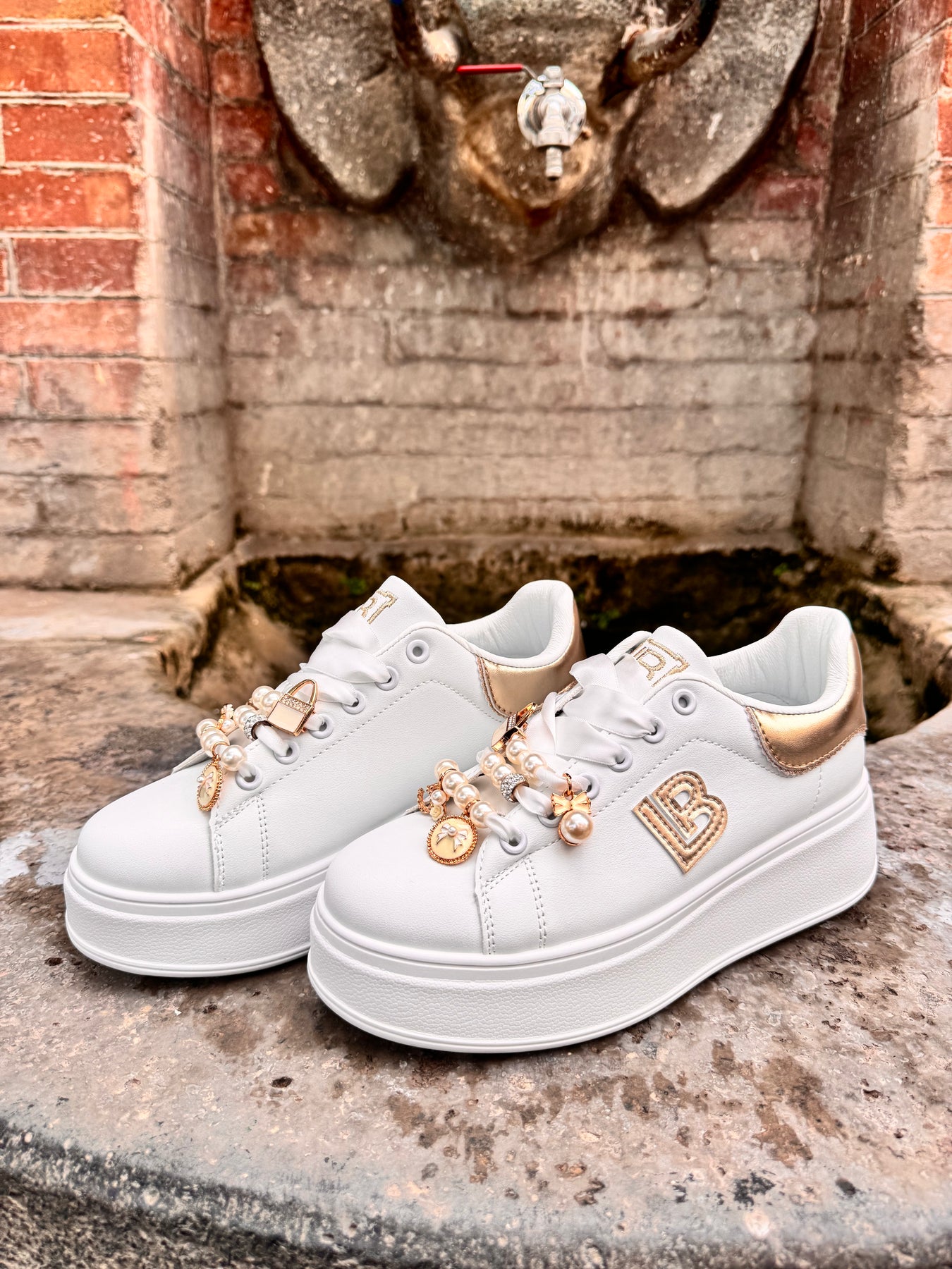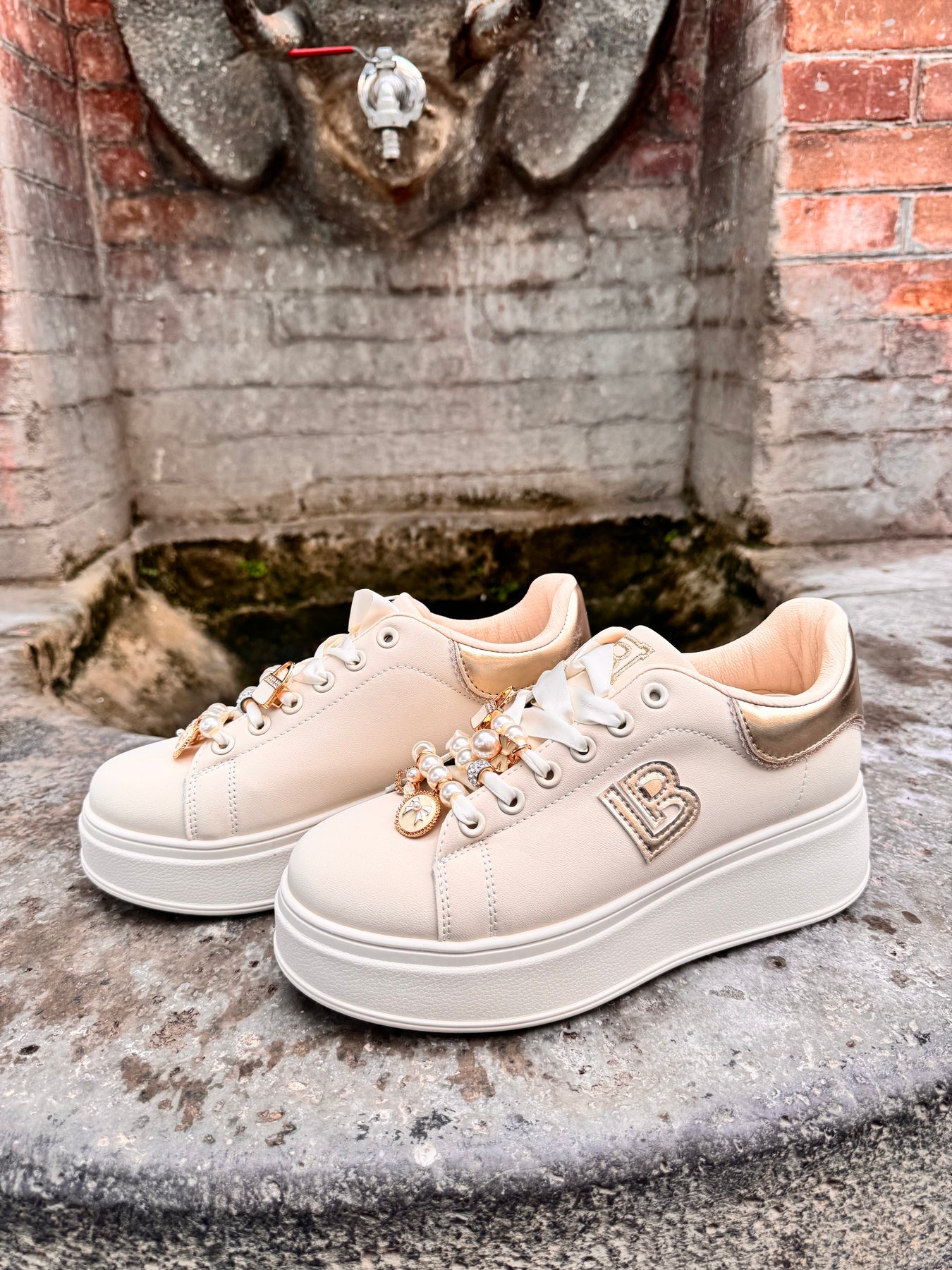 Sneakers in ecopelle con lacci in raso intercambiabili con lacci in tessuto che escono in dotazione, arricchita con perline e charms removibili. Plattform alto 5 cm. Sottopiede estraibile in memory.