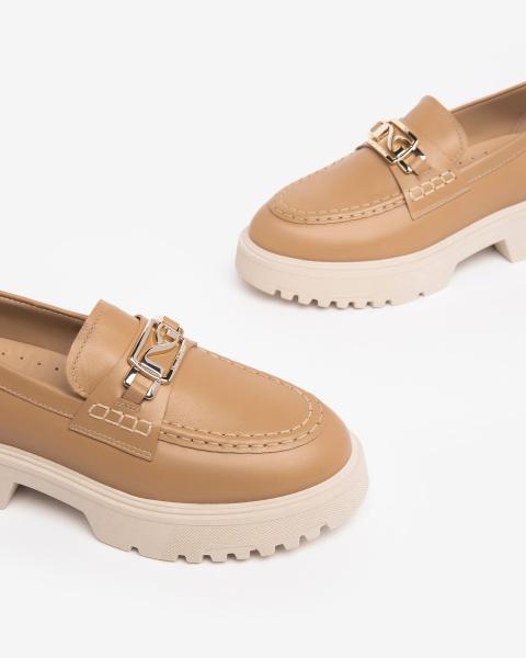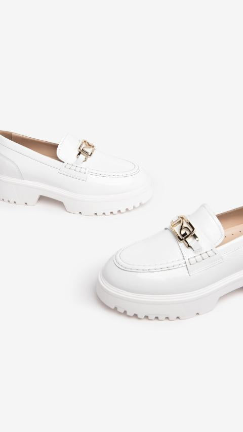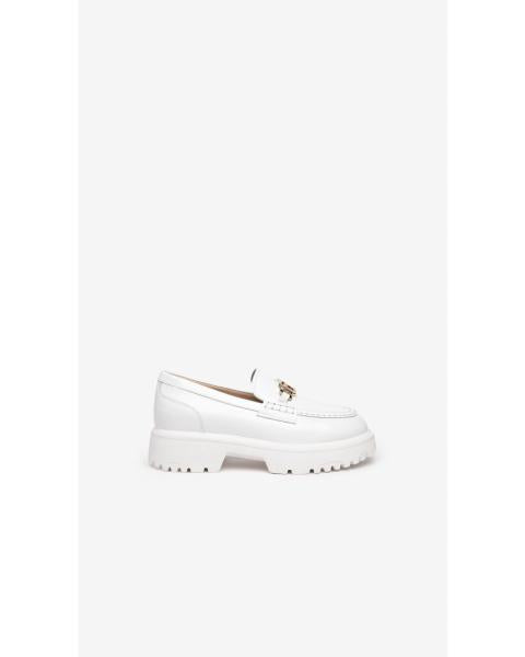 Mocassino in pelle ( la bianca è in pelle lucida) con morsetto in oro sul quale troviamo il logo NG