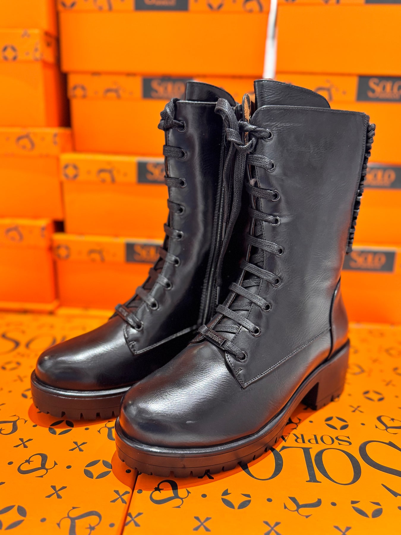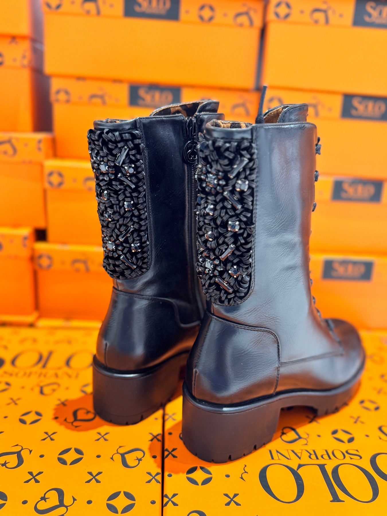 Anfibio in eco pelle nero con lacci e zip intera per la chiusura. decorato nella parte posteriore alta da intrecci in tessuto e corallini.