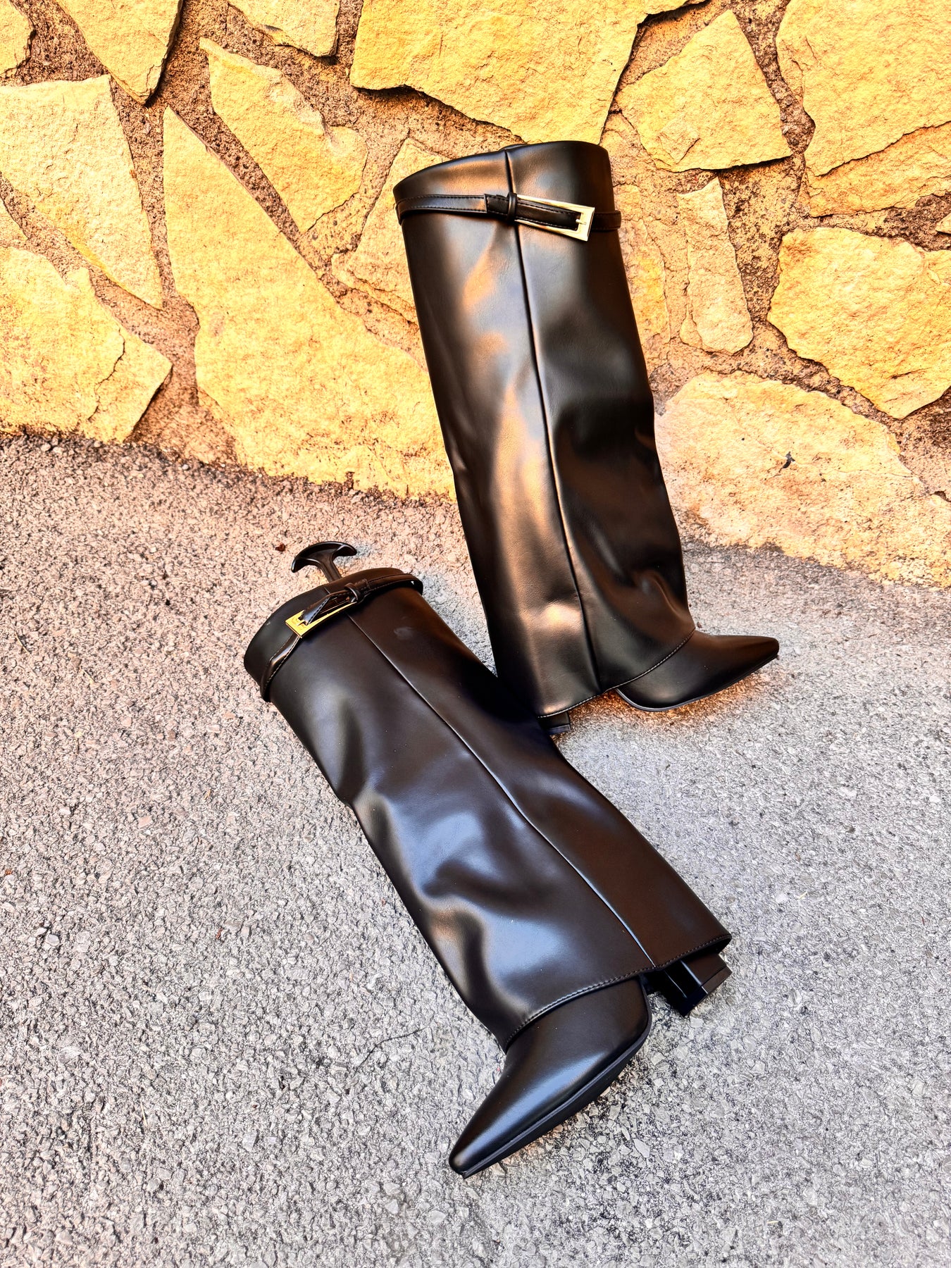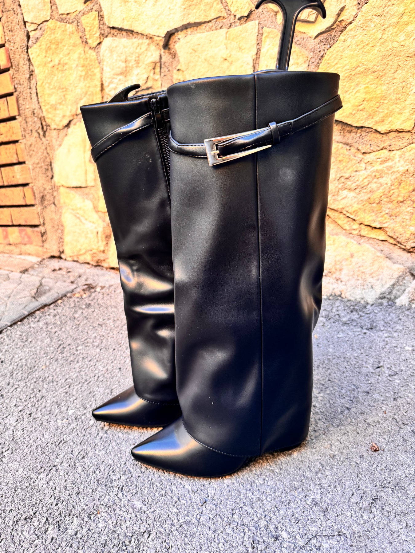 Stivale in ecopelle con risvolto lungo che copre un tacco largo alto 10 cm.