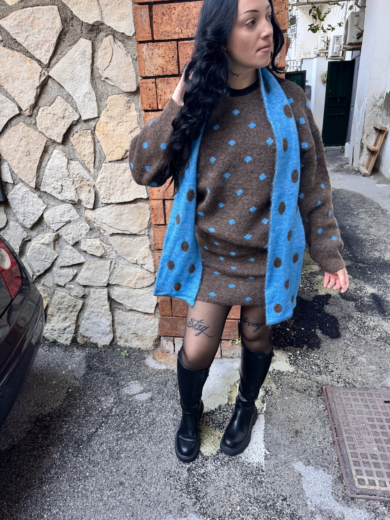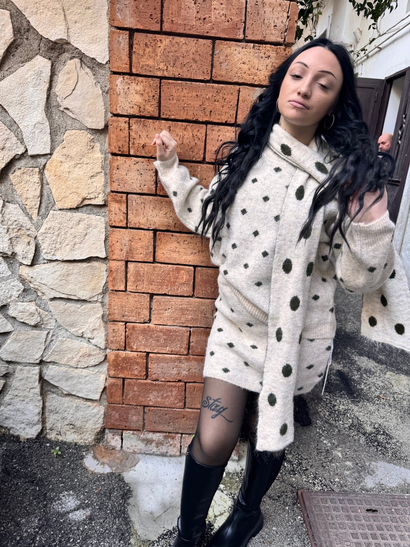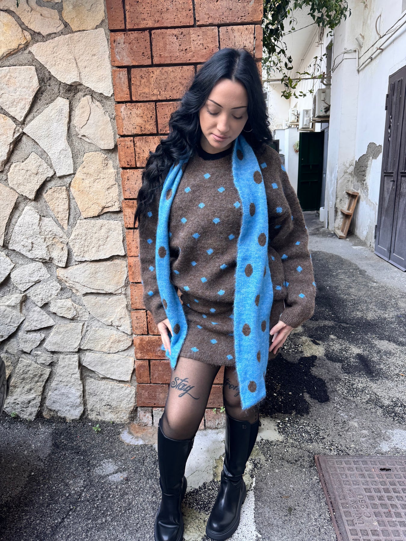 Cordset in lana morbida in contrasto di colore composto da gonna in taglia unica pull in taglia unica e sciarpina.