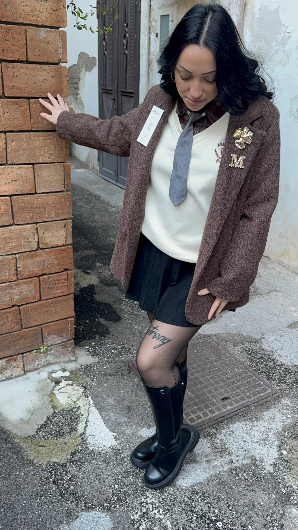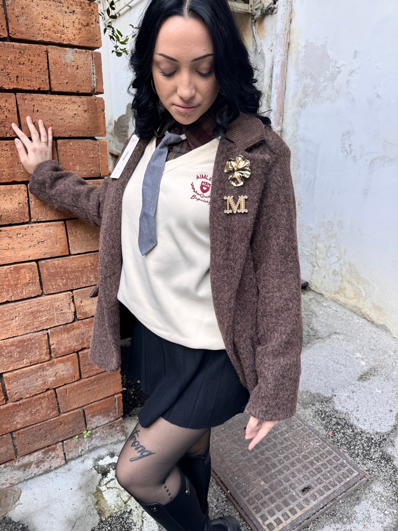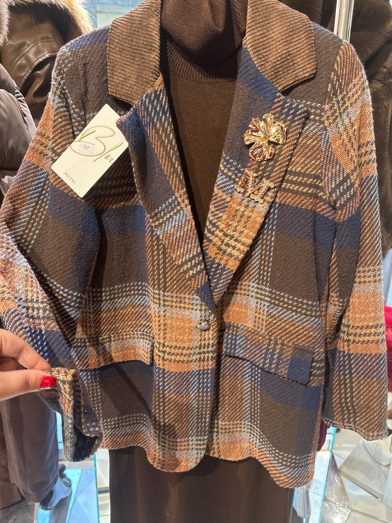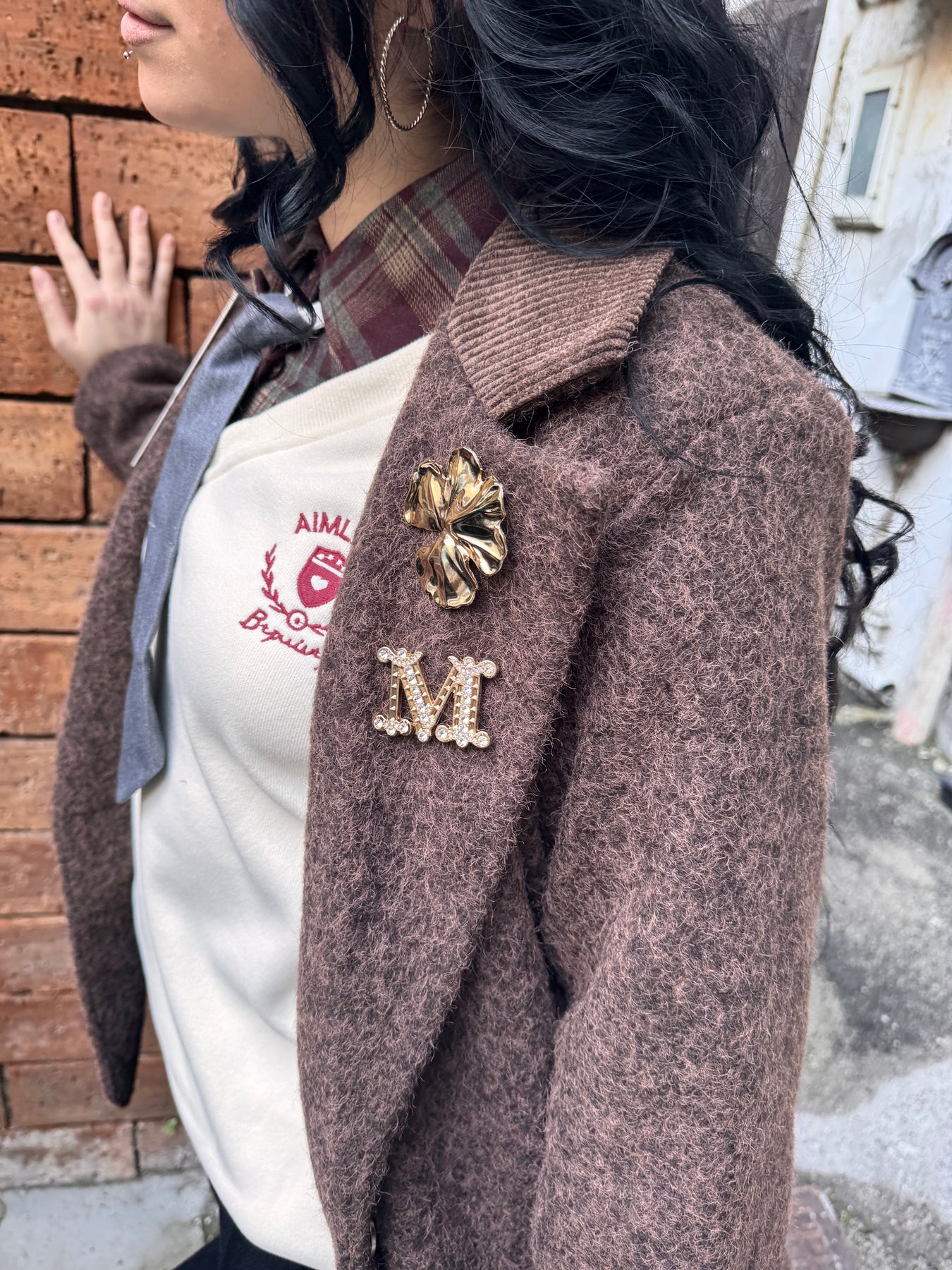 Giacca in lana taglia unica leggermente over con bottone, finte tasche e spille porta fortuna