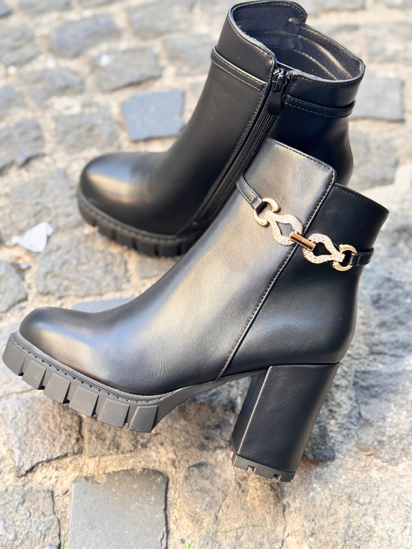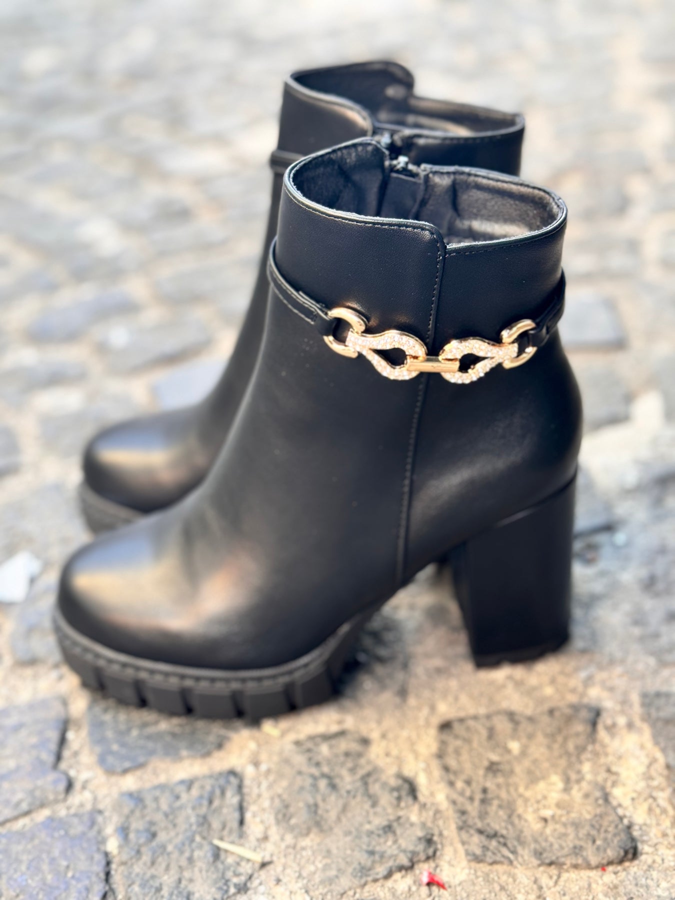Tronchetto in eco pelle con cinturino in metallo oro e brillantini tacco a blocco alto 10 cm con platoux di 2 cm chiusura con lampo laterale