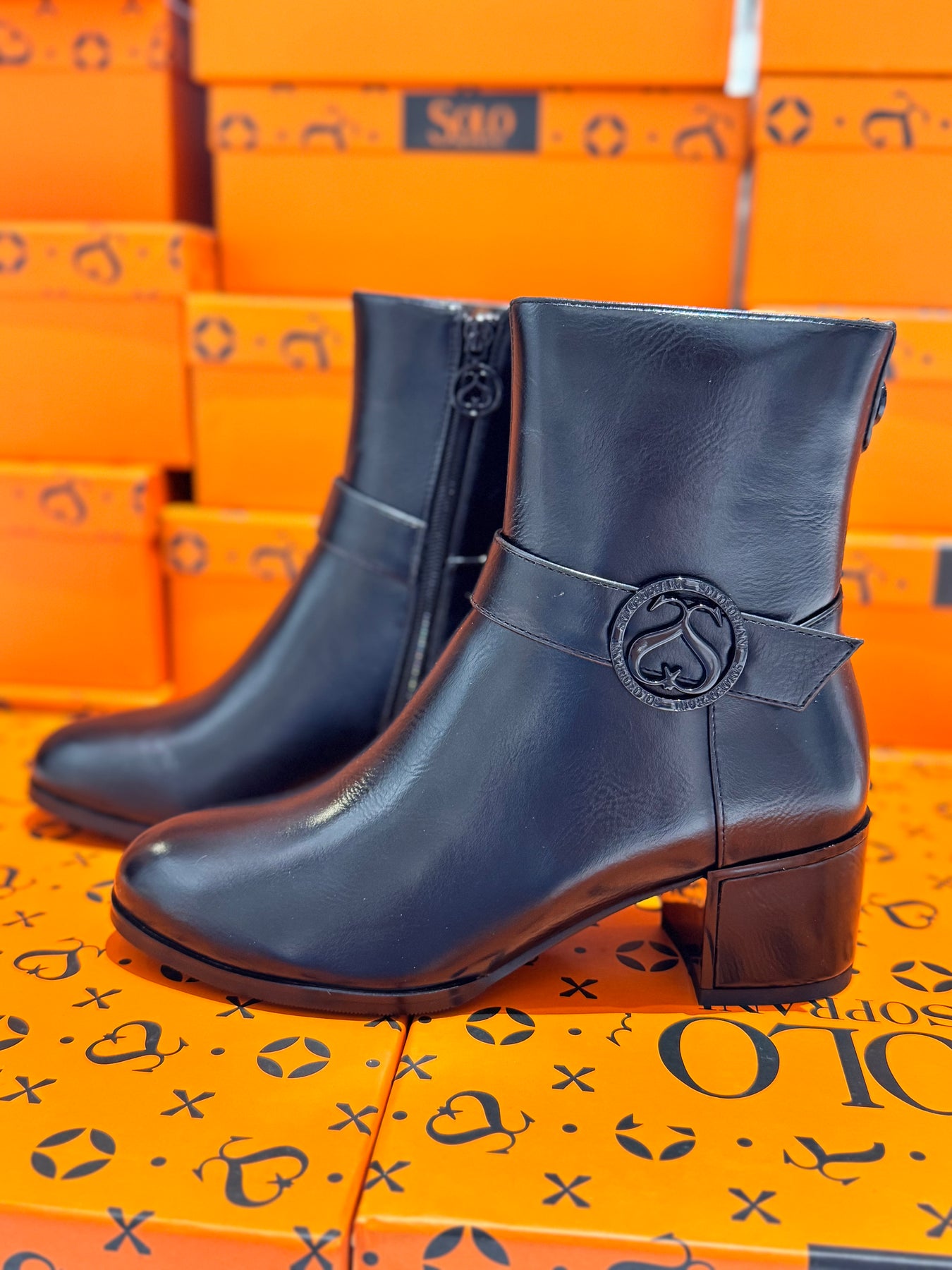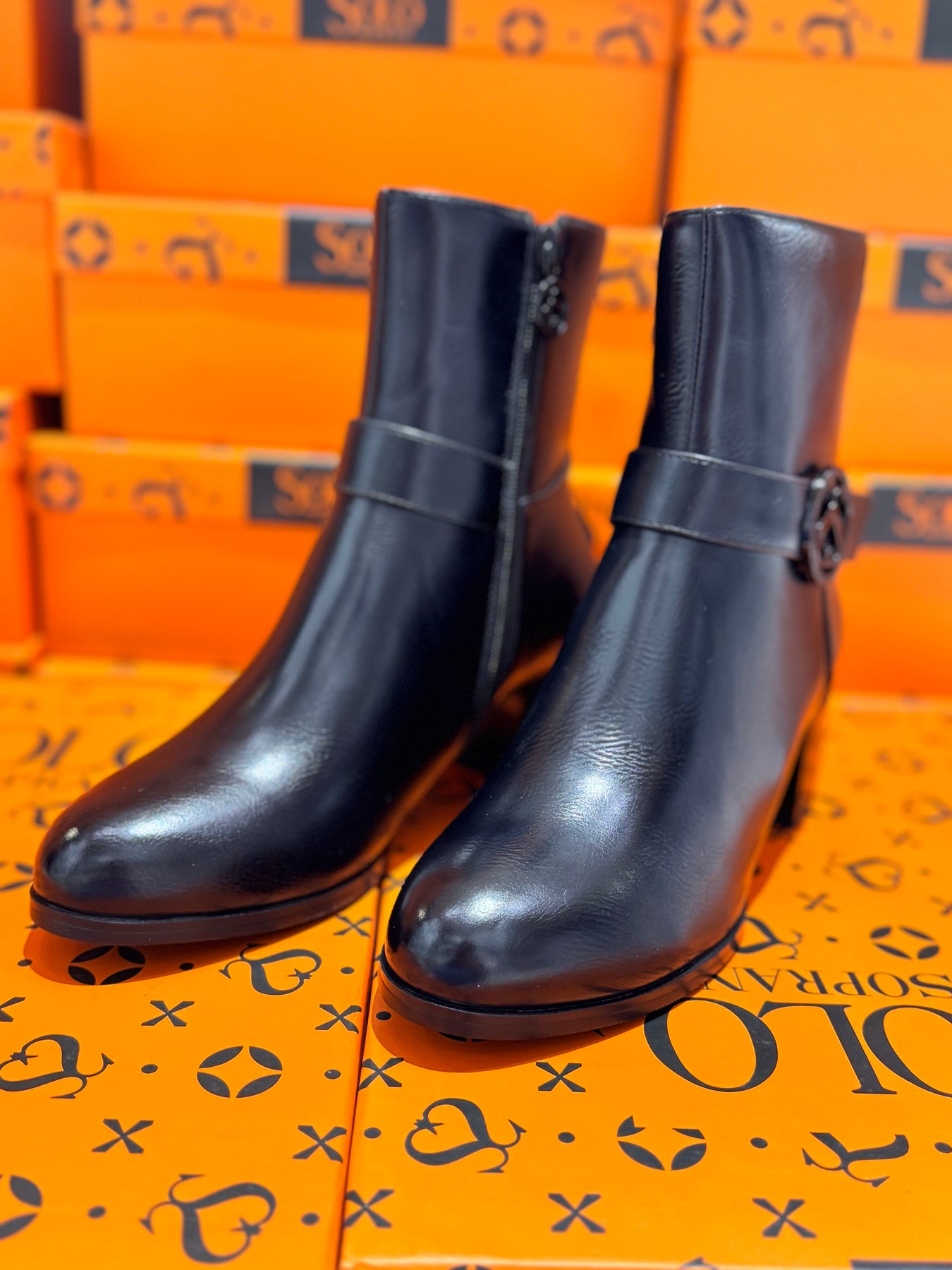 Tronchetto in eco pelle con finto cinturino che chiude con logo laterale. Tacchetto di 5 cm rivestito in eco pelle come il Tronchetto. Suola antiscivolo, chiusura con lampo laterale
