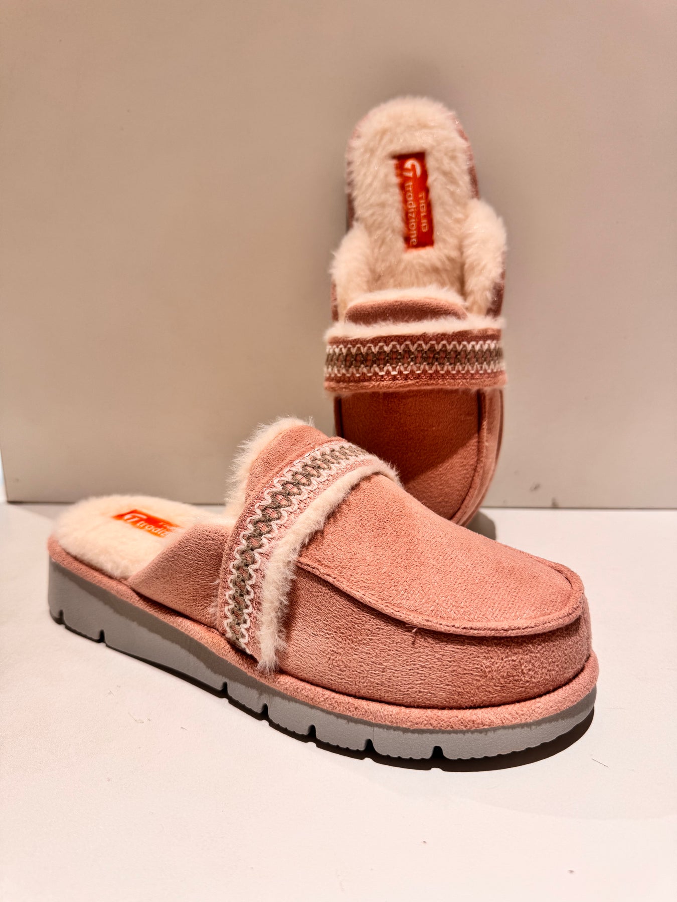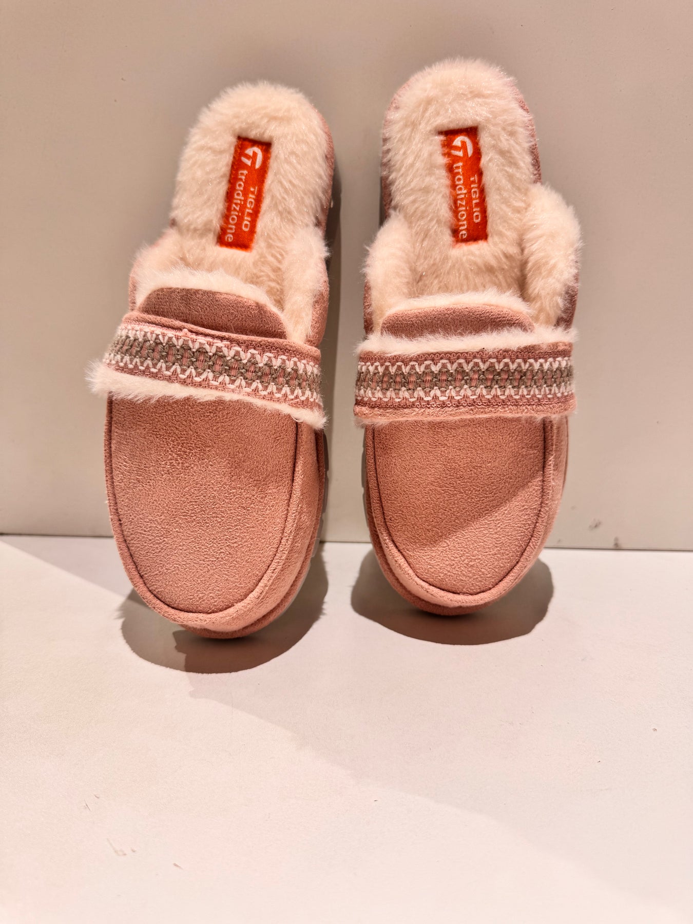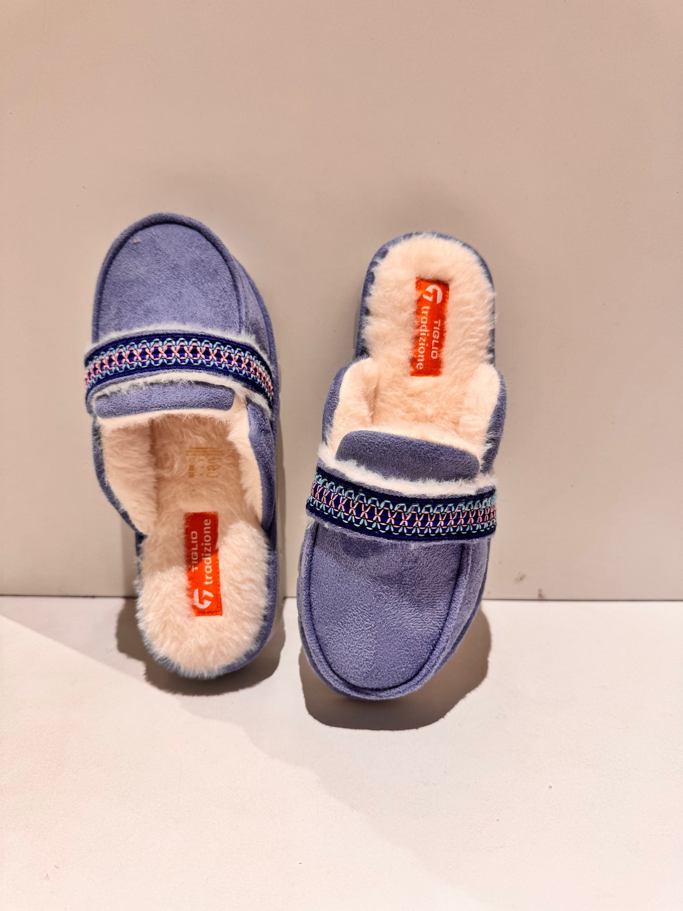 Pantofole in lana con interno morbido e impellicciato, decorato con treccia colorata, forma a sabó.