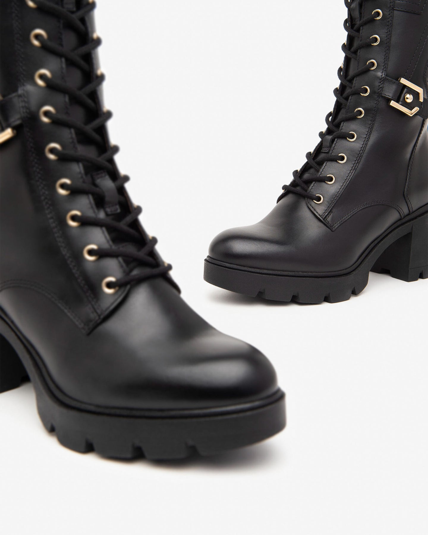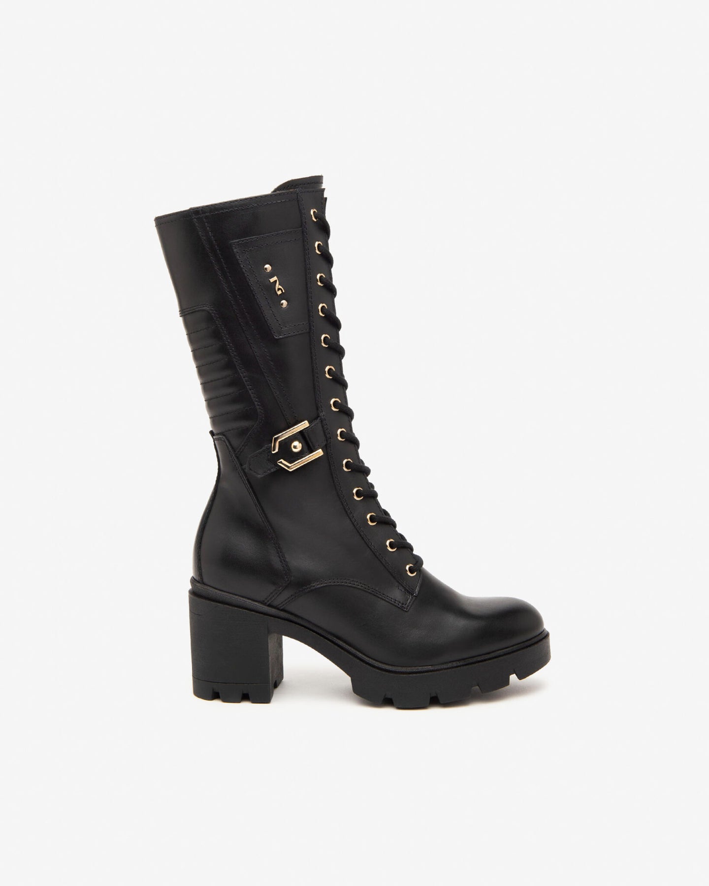 Anfibio con tacco in vera pelle nero con accessori metallici coloro oro