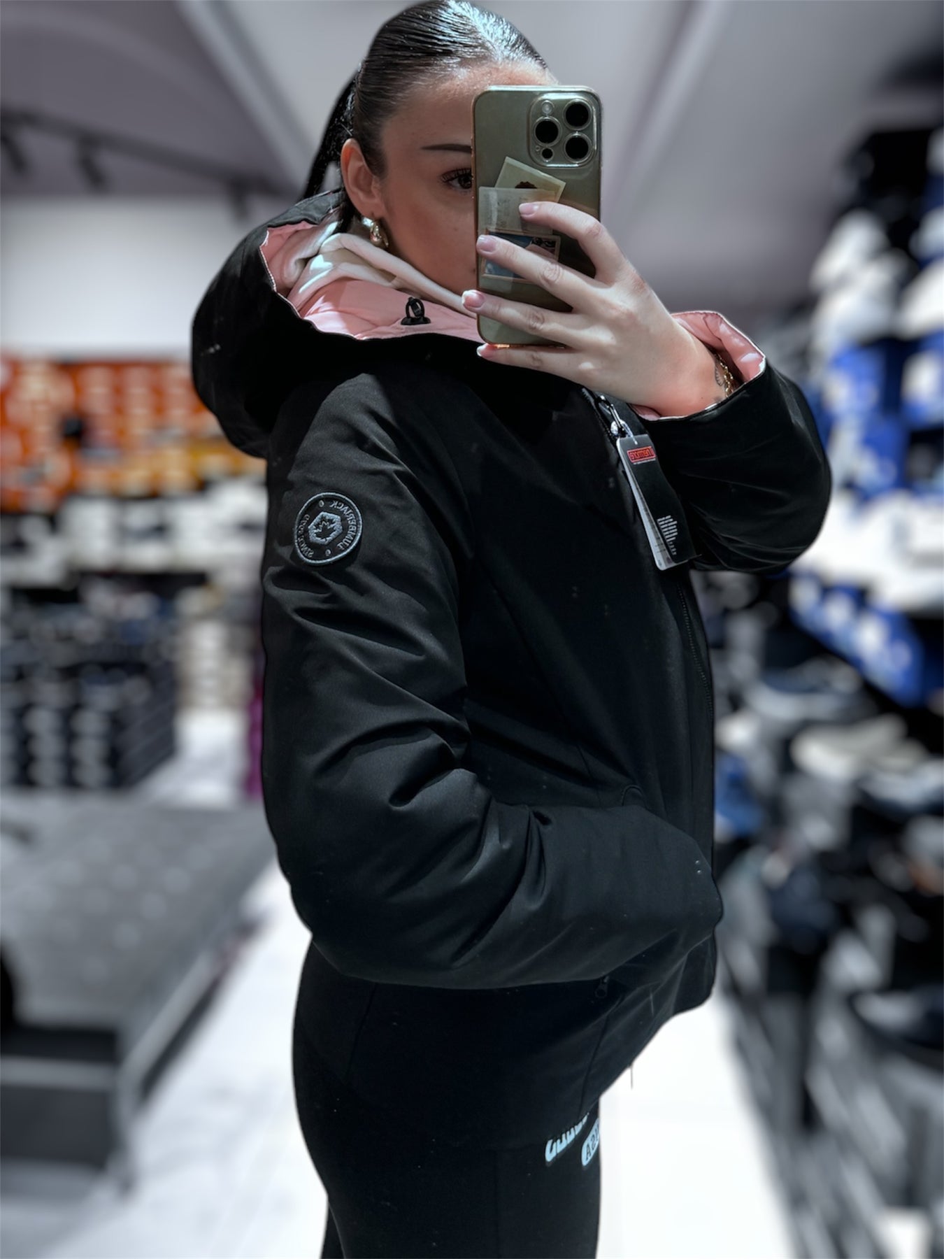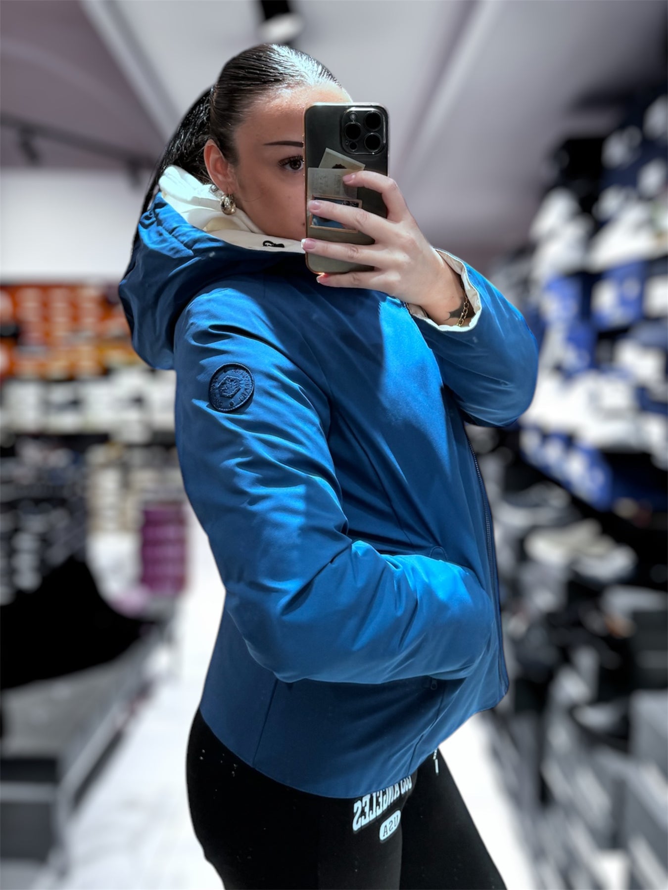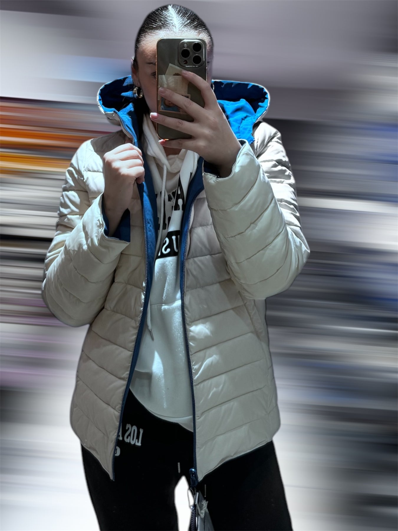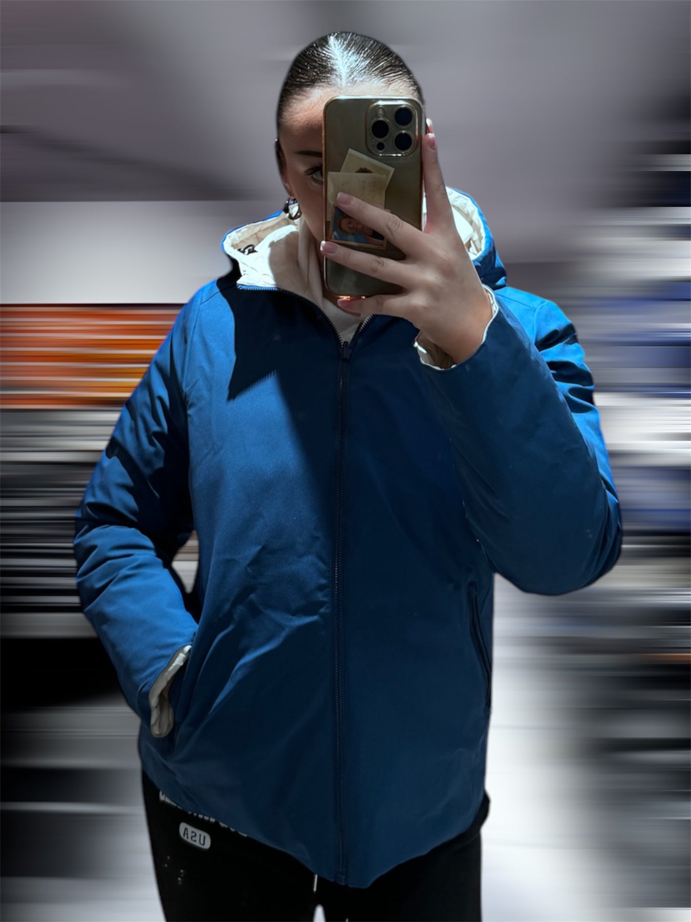 reversibile, infatti l'altro lato diventa un bomberino di un altro colore sempre con chiusura a zip con cappuccio e tasche, queste ultime si chiuderanno con il bottoncino